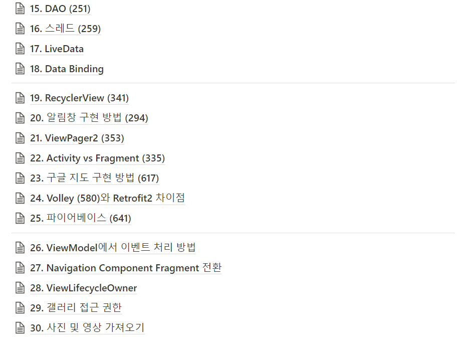 좋은 직장에 취업하는 것도 좋지만 나에게 맞는 분야가 어떤 것인지 항상 고민해왔던 저는 안드로이드가 사막에 있던 오아시스 같았습니다. 그렇게 안드로이드 공부에 대해 흥미가 생긴 저는 "코틀린을 활용한 안드로이드 프로그래밍" 책을 다시 복습하고 "Doit! 깡샘의 안드로이드 앱 프로그래밍 with 코틀린" 책을 노션에 정리하며 추가적인 공부를 했습니다.
