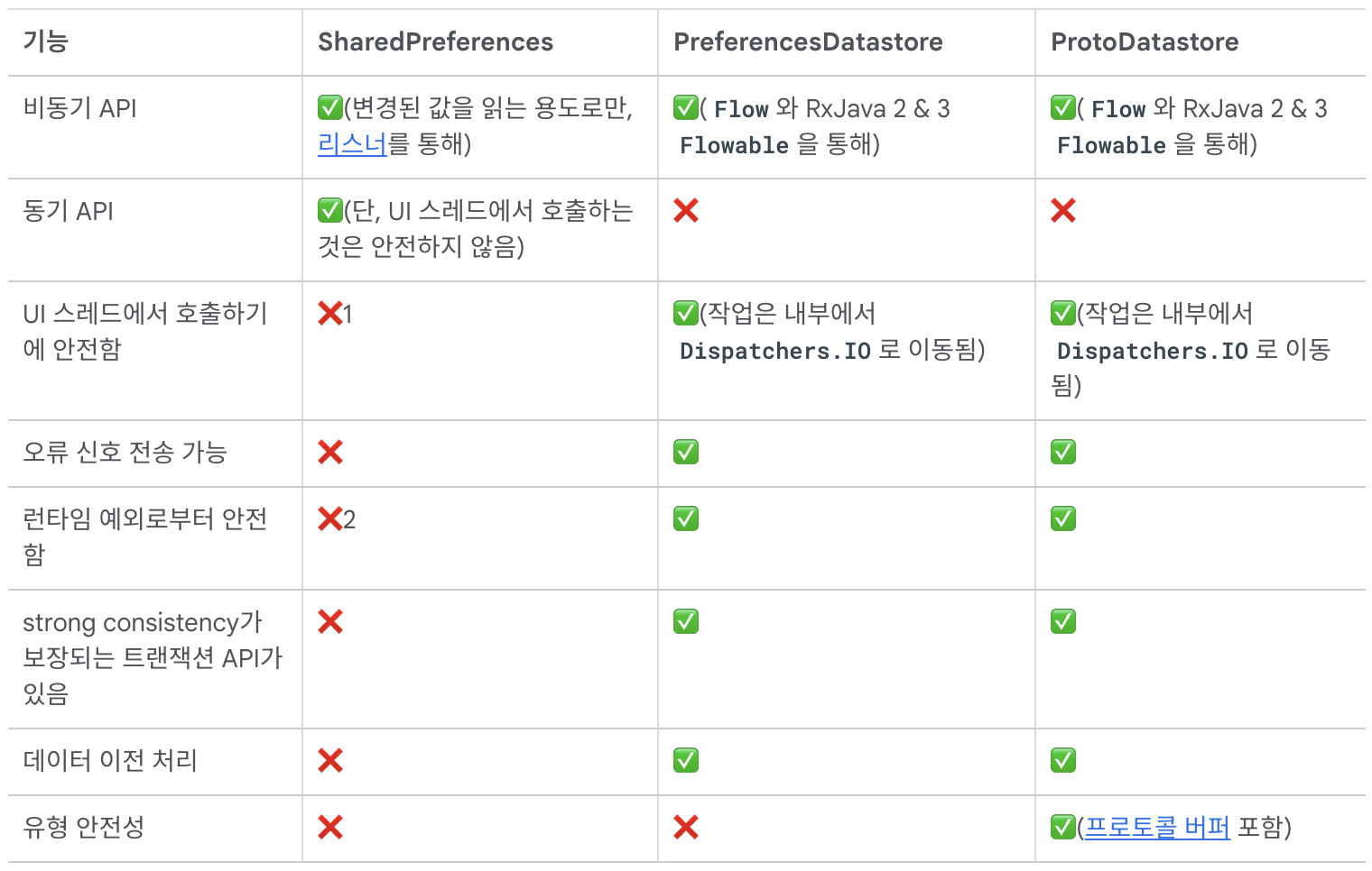 SharedPreferences의 한계점 Datastore가 나오기 전까지 안드로이드에서는 가벼운 데이터를 key-value 쌍으로 저장하기 위해 SharedPreferences를 사용했다. SharedPreference는 다양한 한계점이 있었다. SharedPreferenc