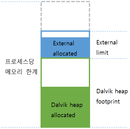 - Dalvik heap 영역과 External 영역은 각각 프로세스당 메모리 한계까지 확장될 수 있다.
