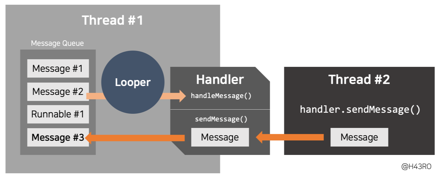 - Looper 클래스 : Loop 를 실행하고, 그 Loop 안에서 Message Queue 로 전달되는 메시지가 존재하는지 검사한다. 그리고 새로운 메시지가 도착하면, 해당 메시지를 처리할 Handler 메서드를 실행한다.