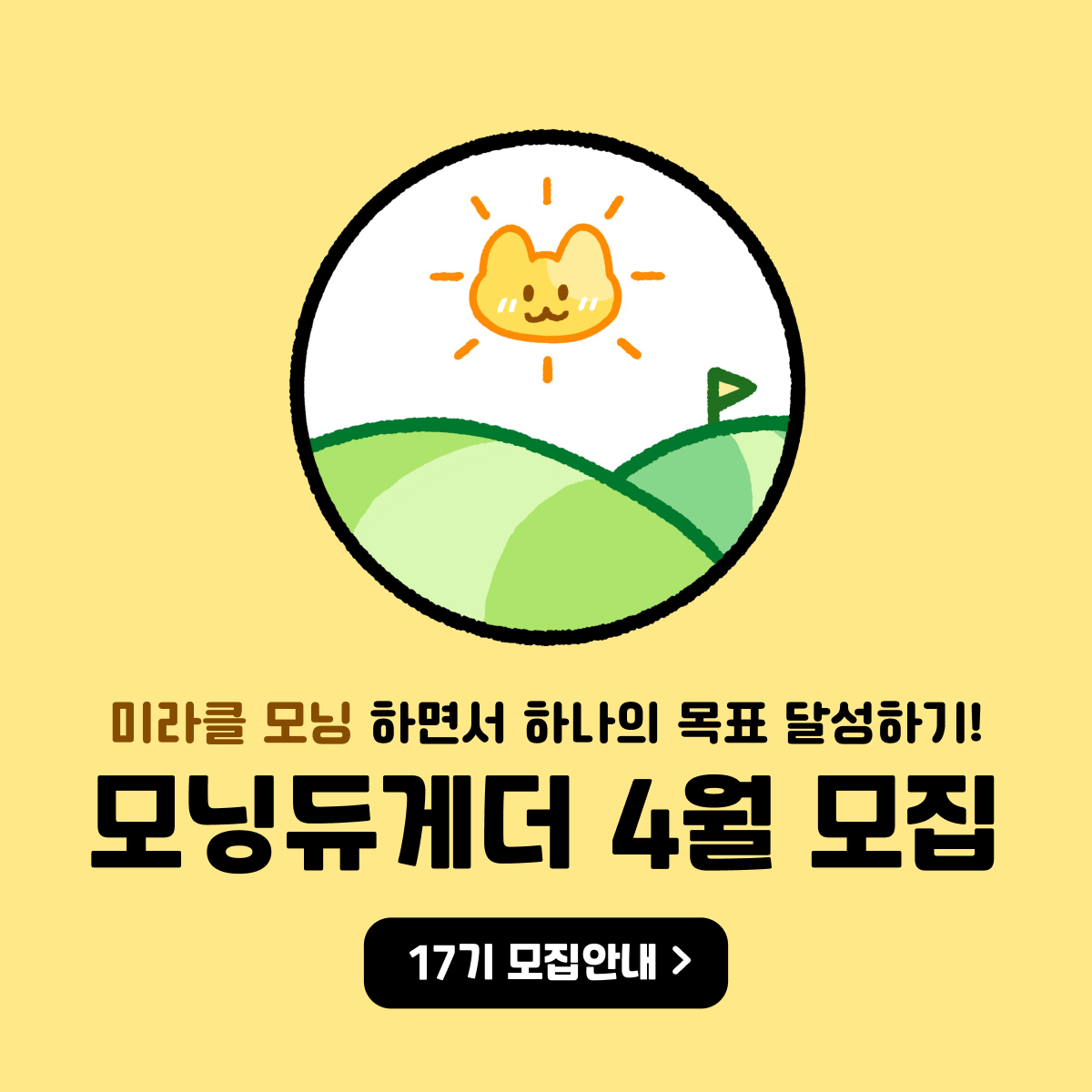 | [2025년 5월] 미라클모닝 스터디 모닝듀게더 18기 모집 (3) | 2025.05.06 |