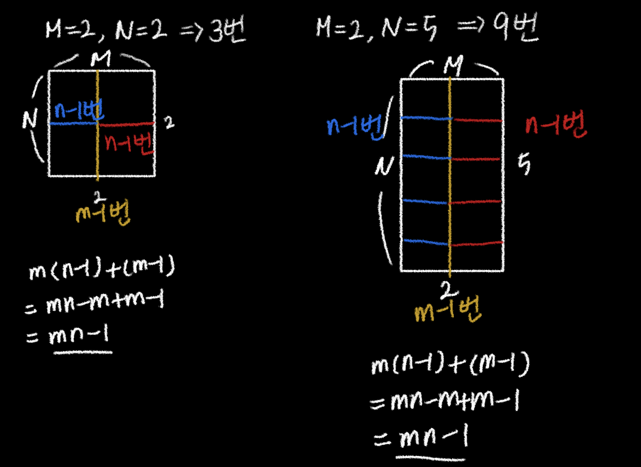 - 즉, 가로를 M - 1 번 자르고 나면 M 개의 1 x N 직사각형이 생긴다.