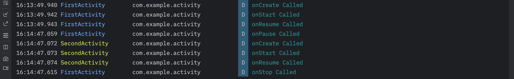 - 첫번째 액티비티에서 onCreate, onStart, onResume, onPause 까지 호출되고, 두번째 액티비티에서 onCreate, onStart, onResume 을 호출한 이후에 다시 첫번째 액티비티에서 onStop을 호출된다.