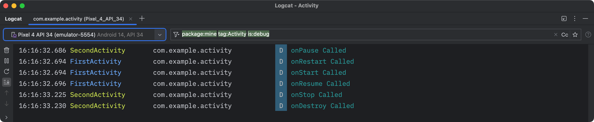 - 두번째 액티비티에서 onPause를 호출한 다음, 첫번째 액티비티에서 onRestart, onStart, onResume 이 호출되고 두번째 액티비티에서 onStop, onDestroy가 호출된다.